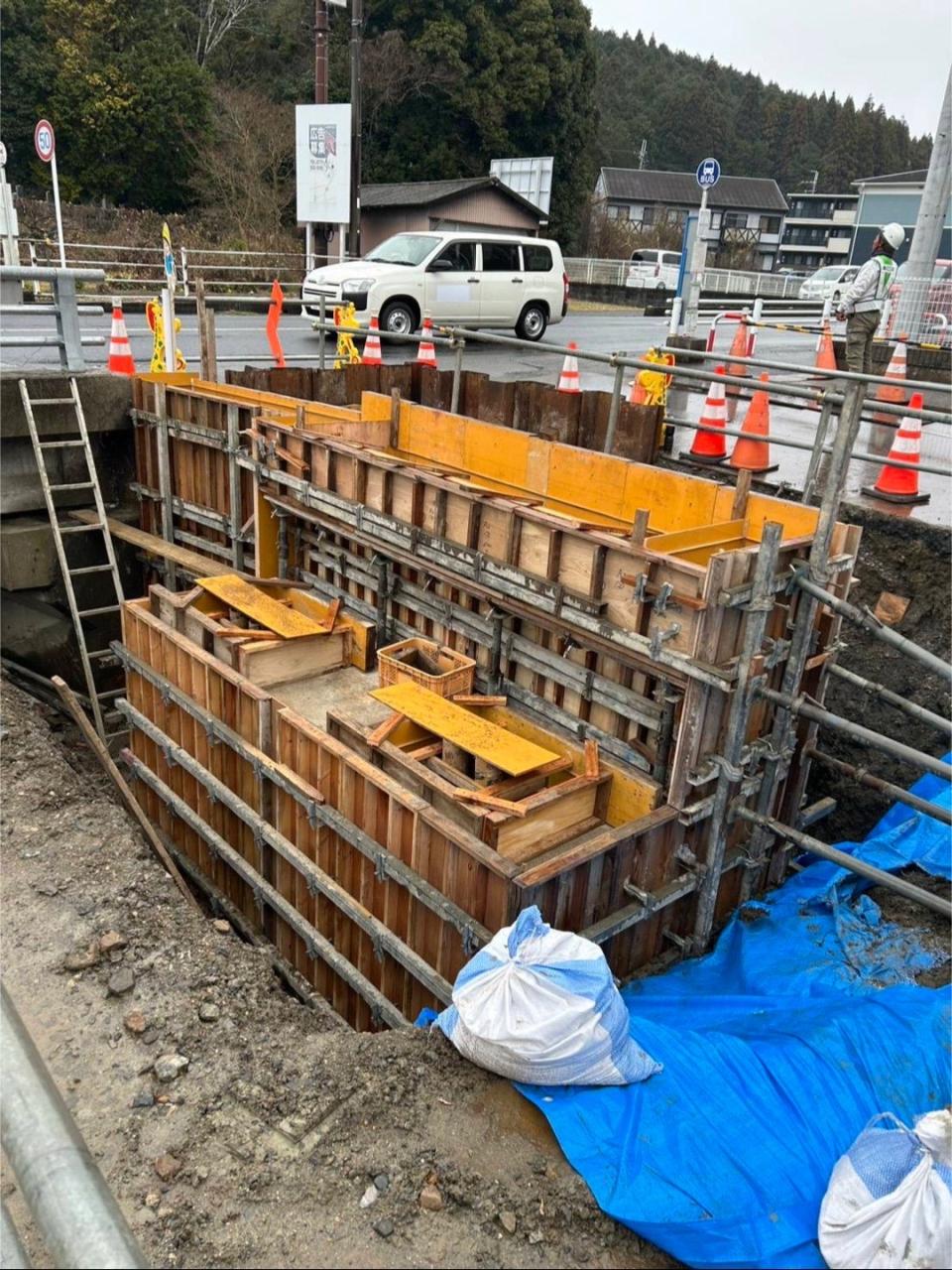木材やパネルを使って、コンクリートの形を作る「枠」を組み立てています。