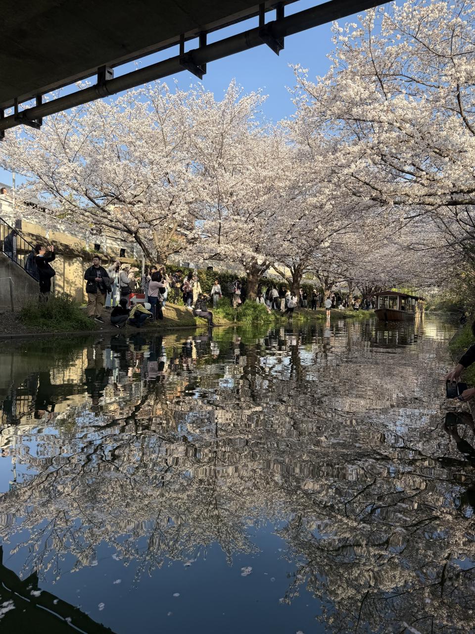 川沿いに並ぶ桜と、水面に映る景色はとても幻想的で、
